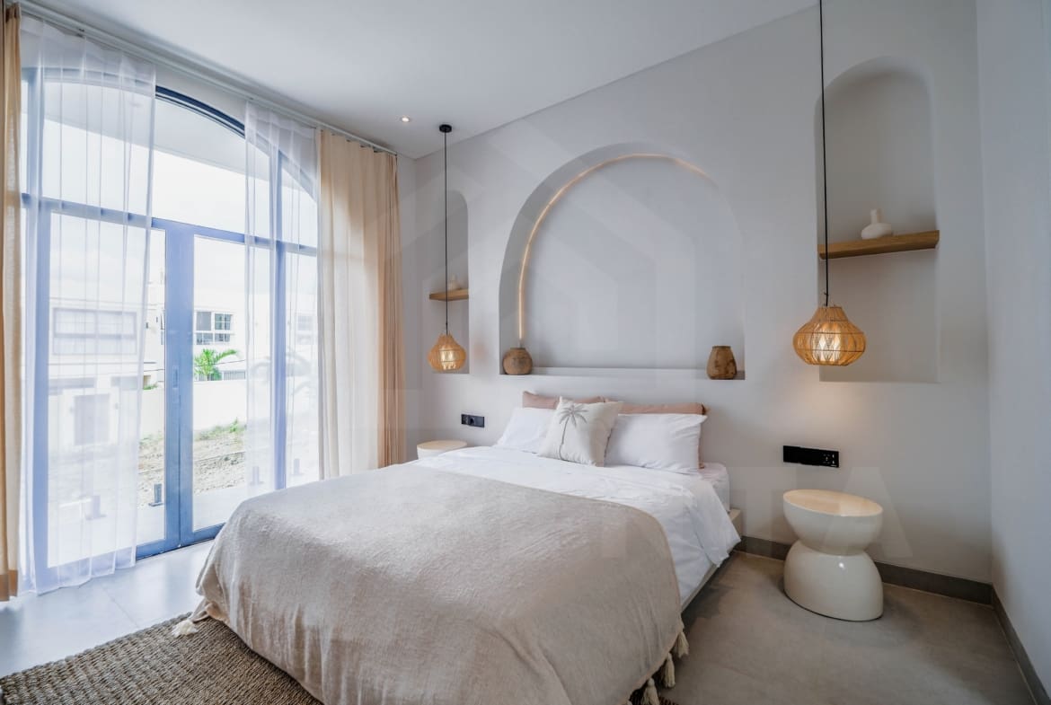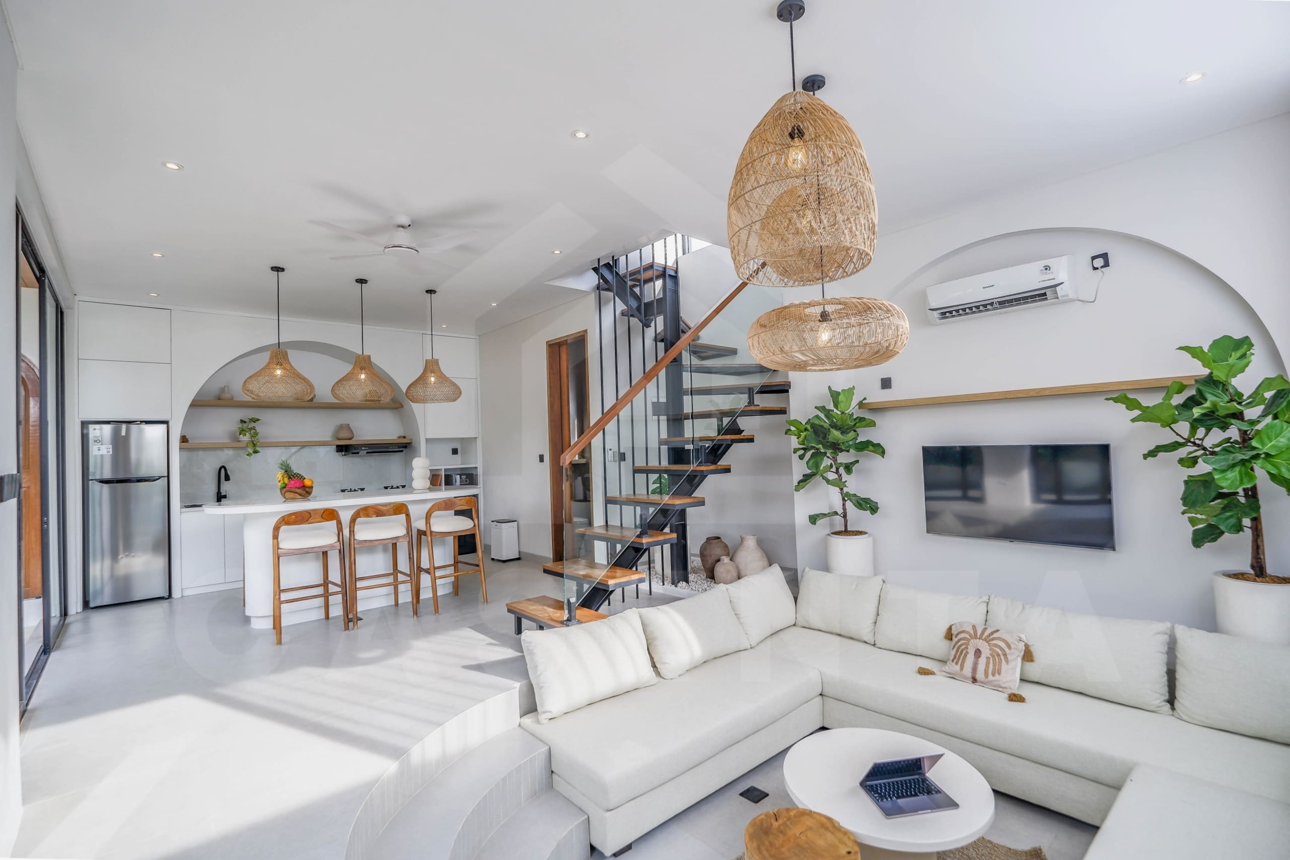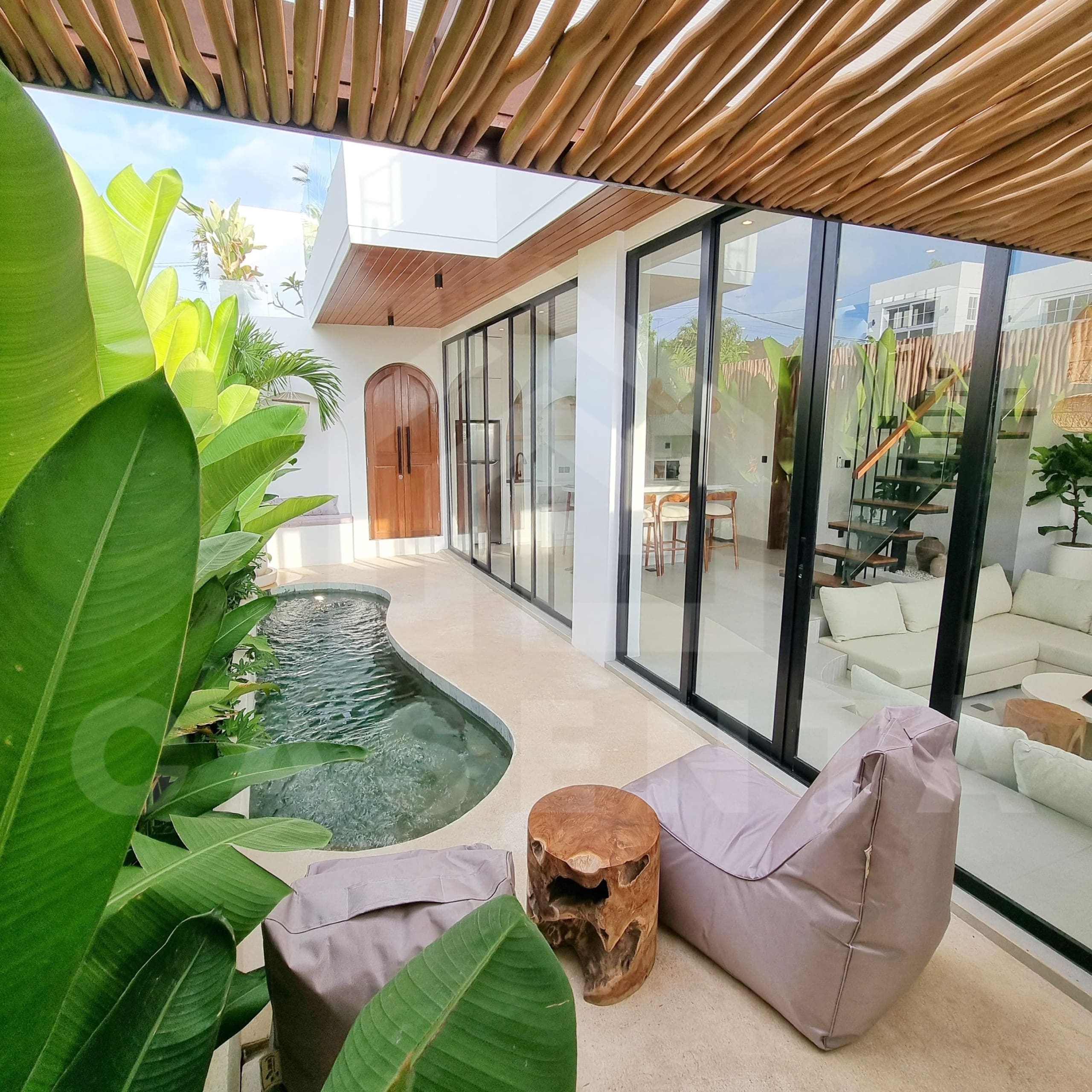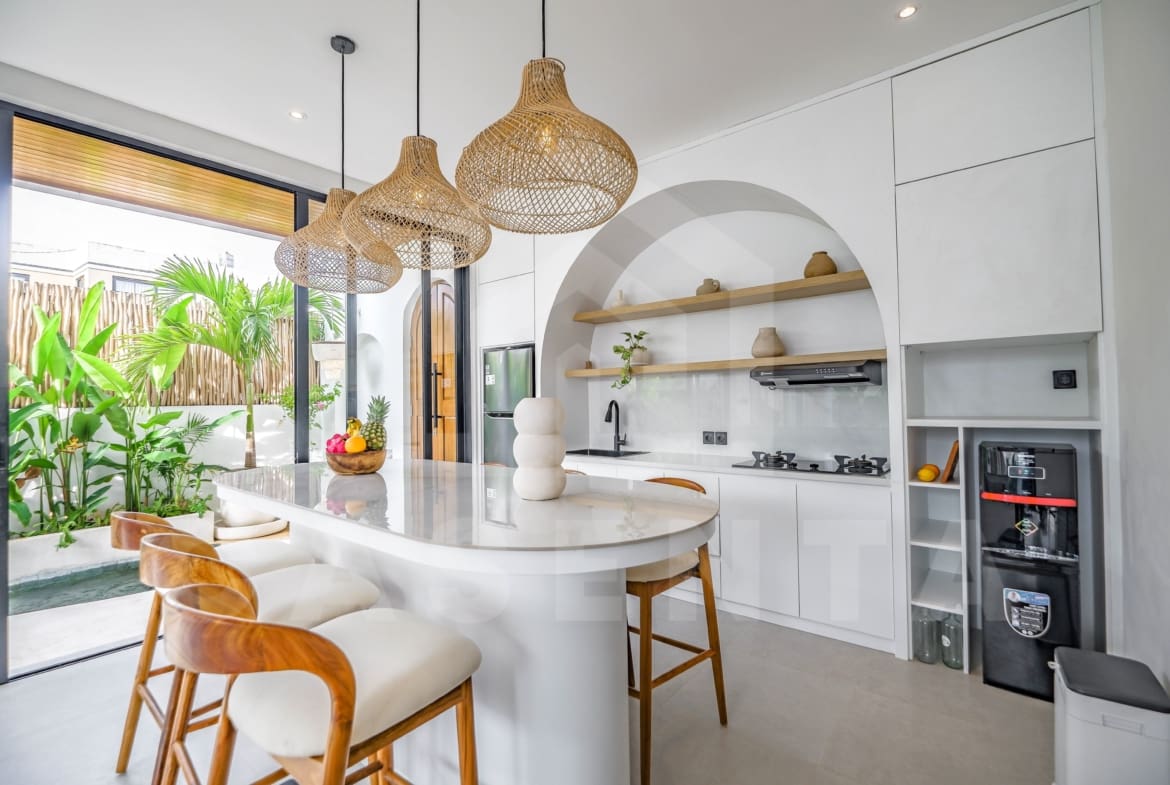 If you are looking for a brand new home to live in or invest, you have come to the right place. Bringing the contemporary Mediterranean design, the property showcases a beautiful facade from the outside. An oasis-shaped pool is placed in front of the living space and this area also comes with relaxing beanbags as well as outdoor shower. The living space is a thing of beauty, hosting both the kitchen and comfortable sunken sofa inside a luminous open layout. The addition of hanging decorative lights, large arch in the kitchen, and rows of tropical plants further highlight the aesthetics of this property.