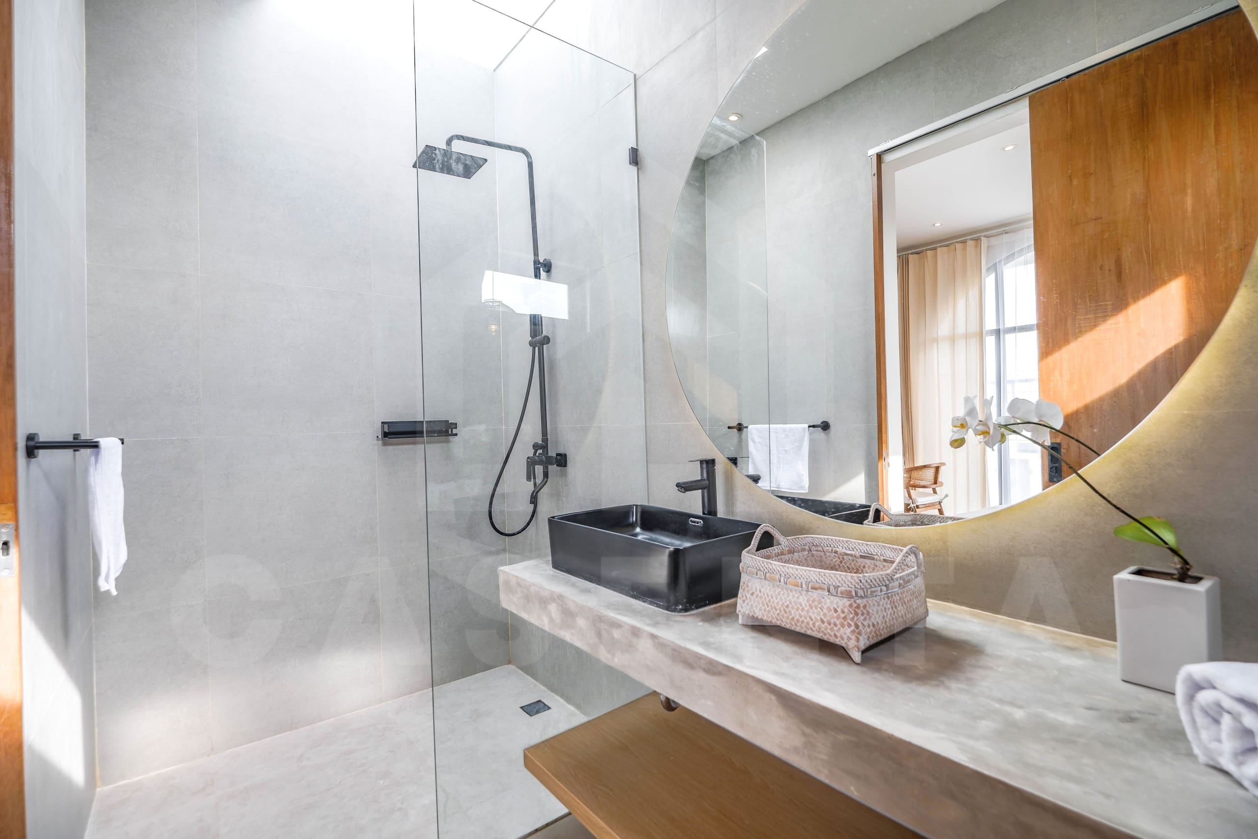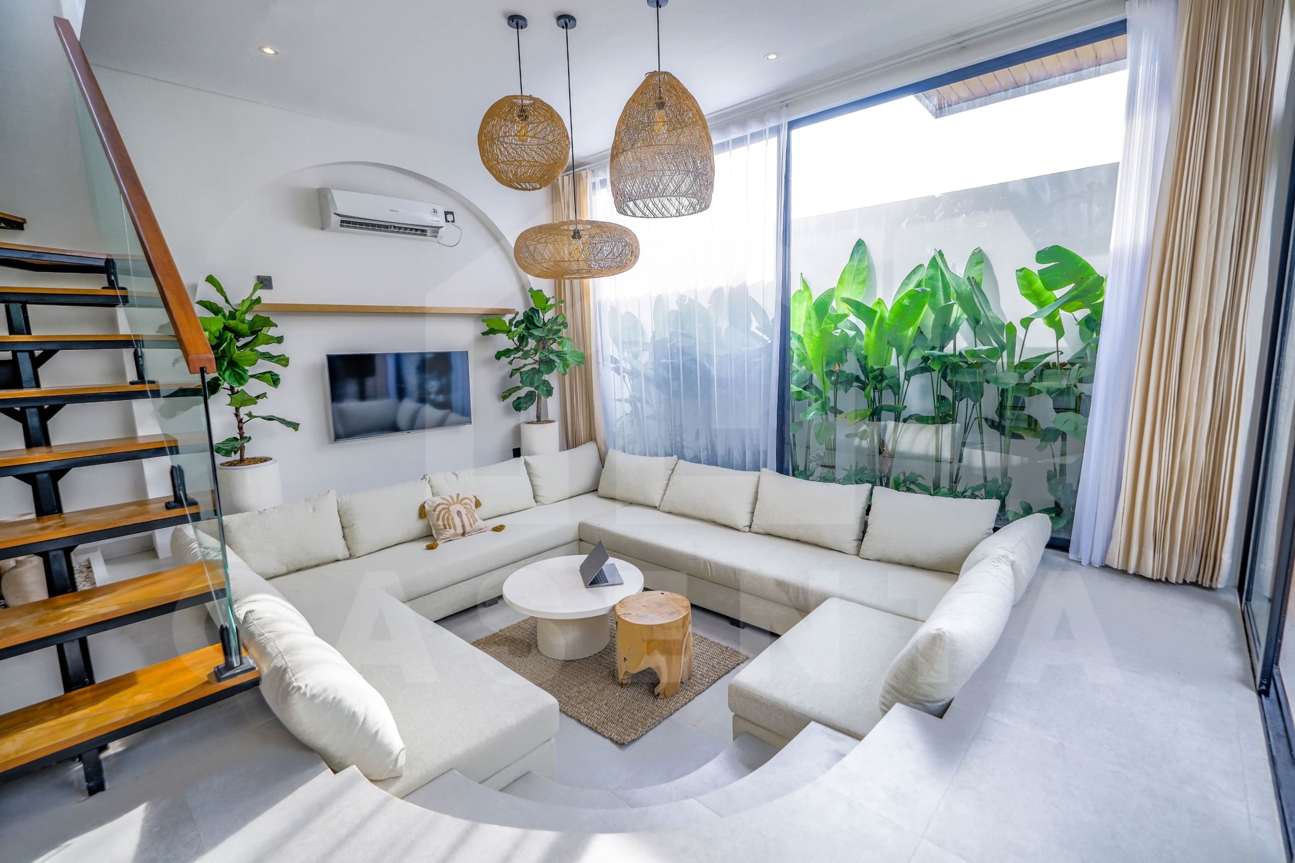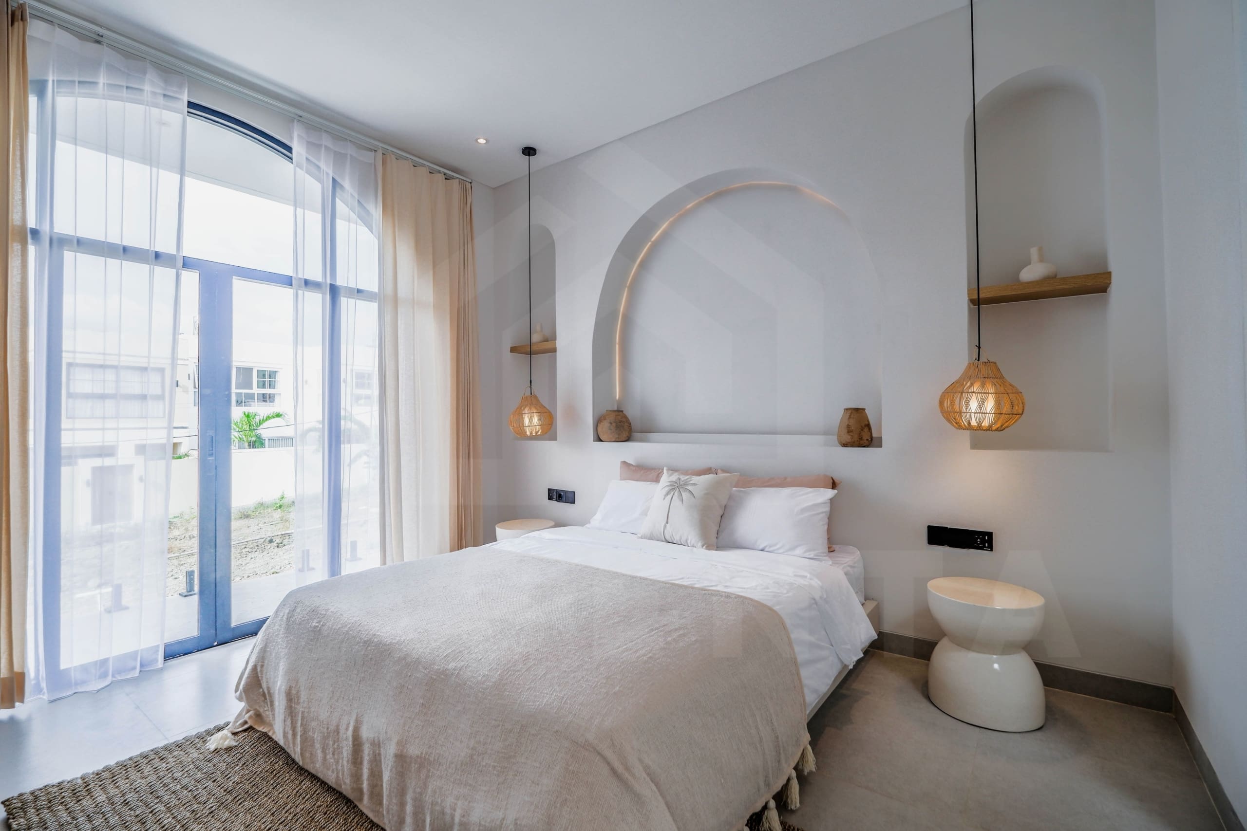 If you are looking for a brand new home to live in or invest, you have come to the right place. Bringing the contemporary Mediterranean design, the property showcases a beautiful facade from the outside. An oasis-shaped pool is placed in front of the living space and this area also comes with relaxing beanbags as well as outdoor shower. The living space is a thing of beauty, hosting both the kitchen and comfortable sunken sofa inside a luminous open layout. The addition of hanging decorative lights, large arch in the kitchen, and rows of tropical plants further highlight the aesthetics of this property.