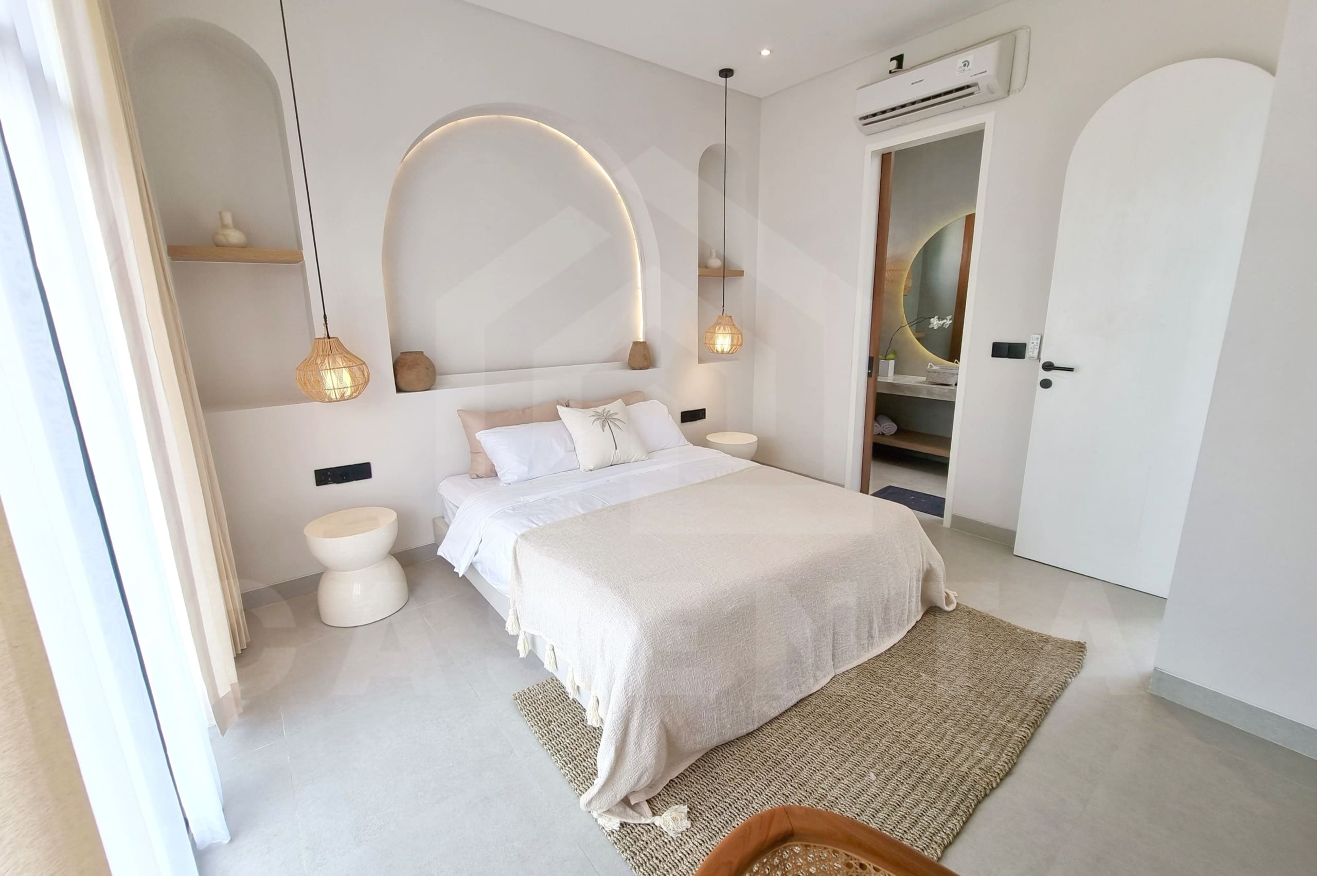 A series of floating steps lead us to the bedrooms. Both rooms have access to the balcony and come with ensuite bathroom as well as dedicated working space. Like every other corners in this villa, the bedrooms are also decorated with arches and hanging lights.