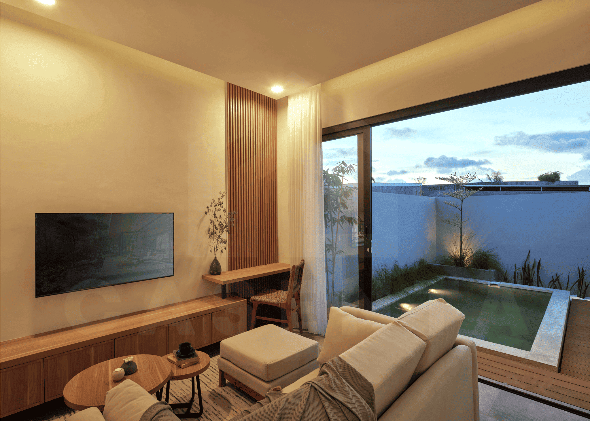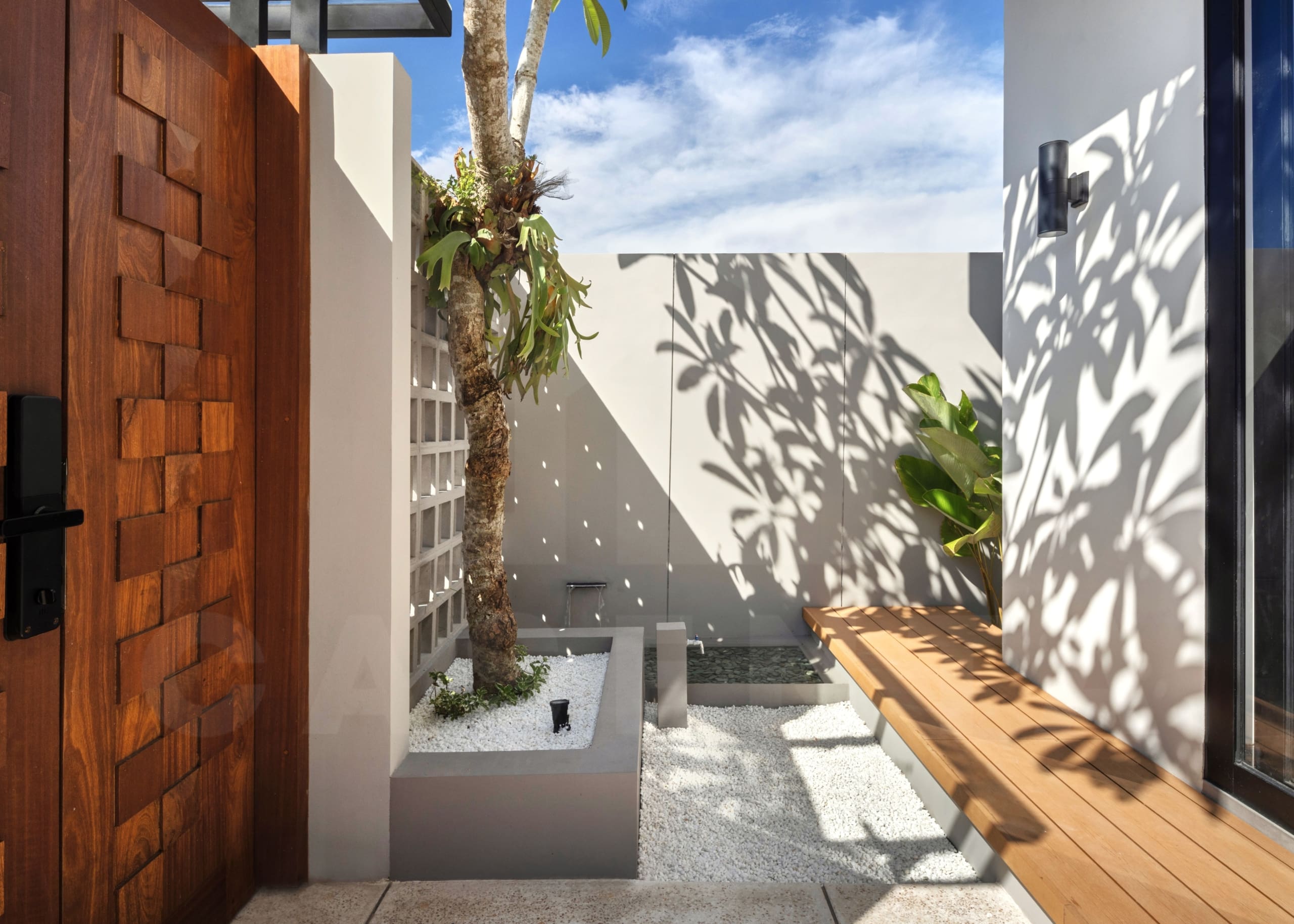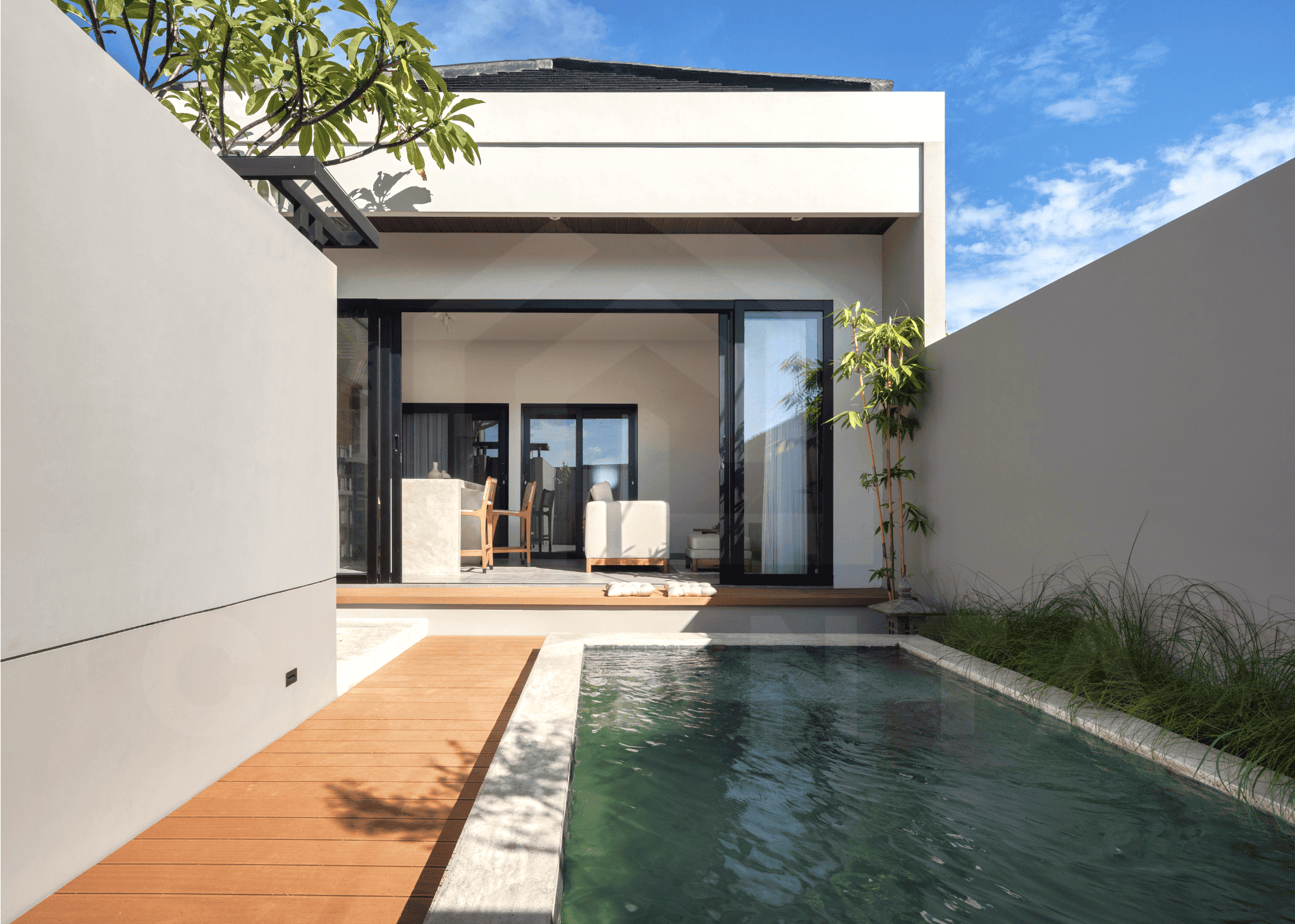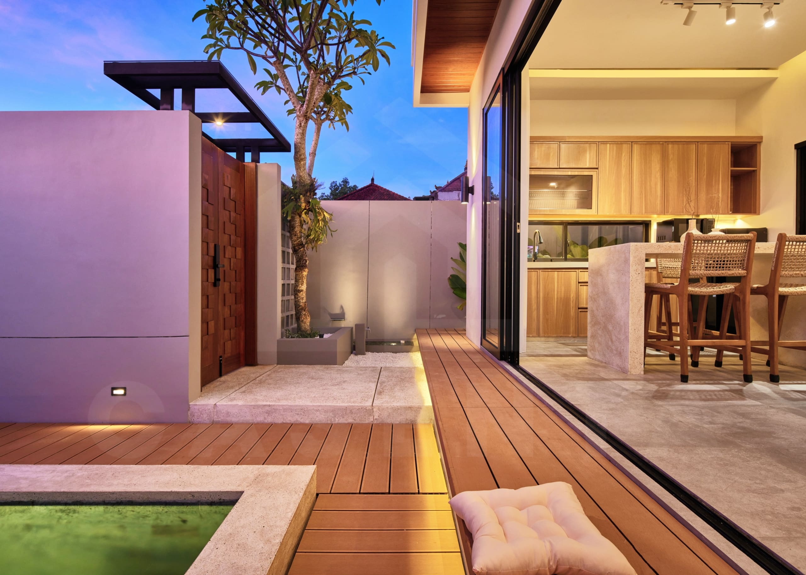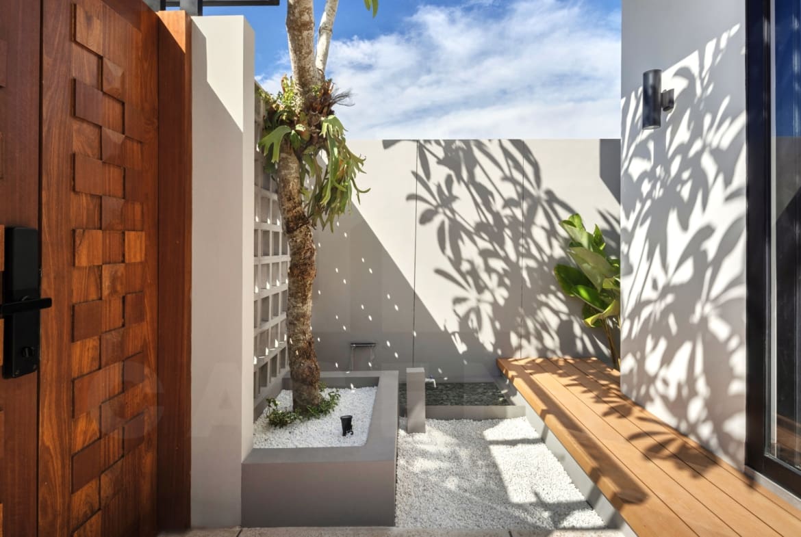 Upon entering the villa, a comforting sight of serene Japanese garden welcomes you. The area is dominated by white marbles and wooden deck with small trees and bushes adding further aesthetics. Traditional Japanese seating and built-in bench are available next to the pool to enjoy relaxing evening by the pool.