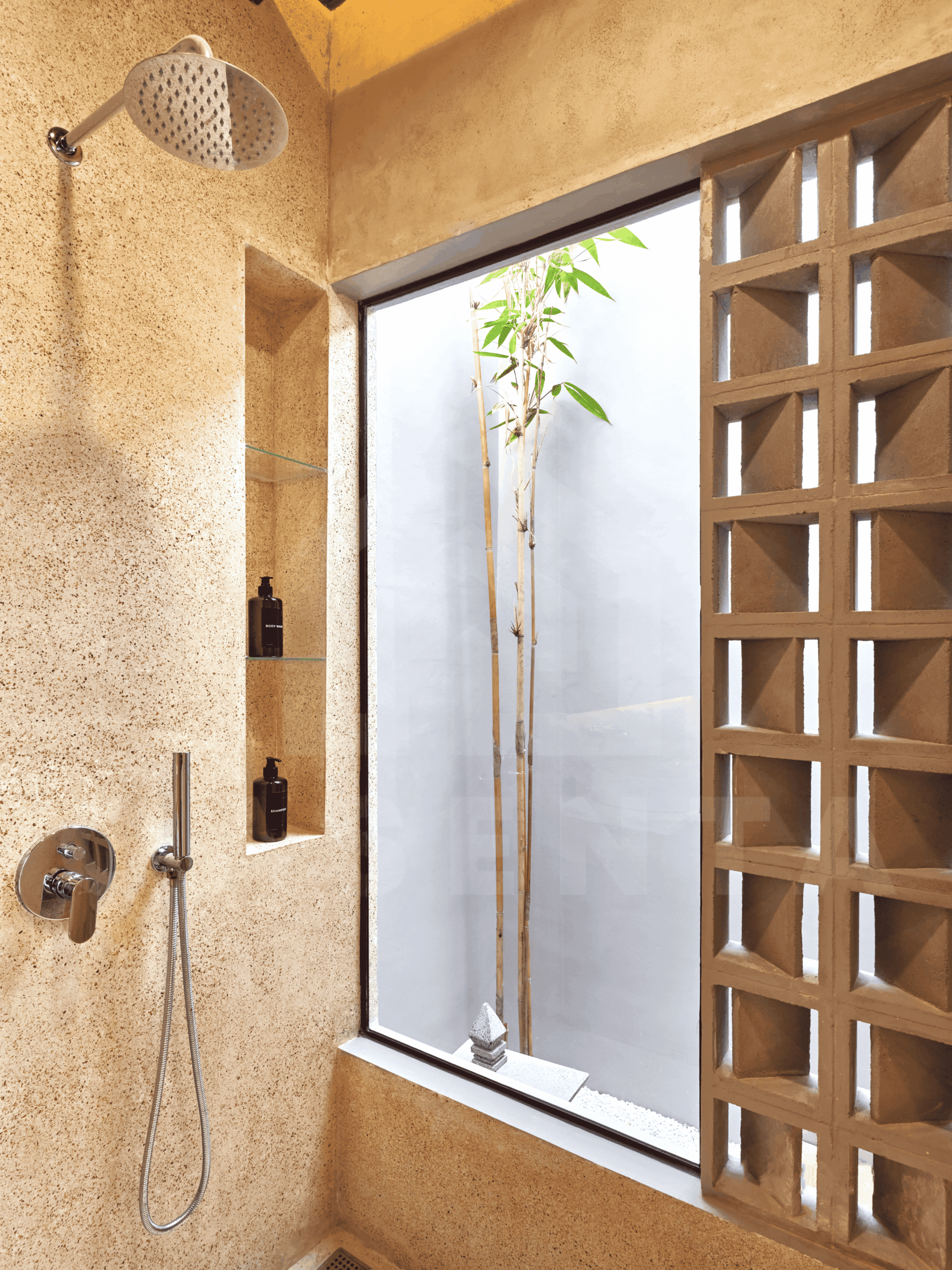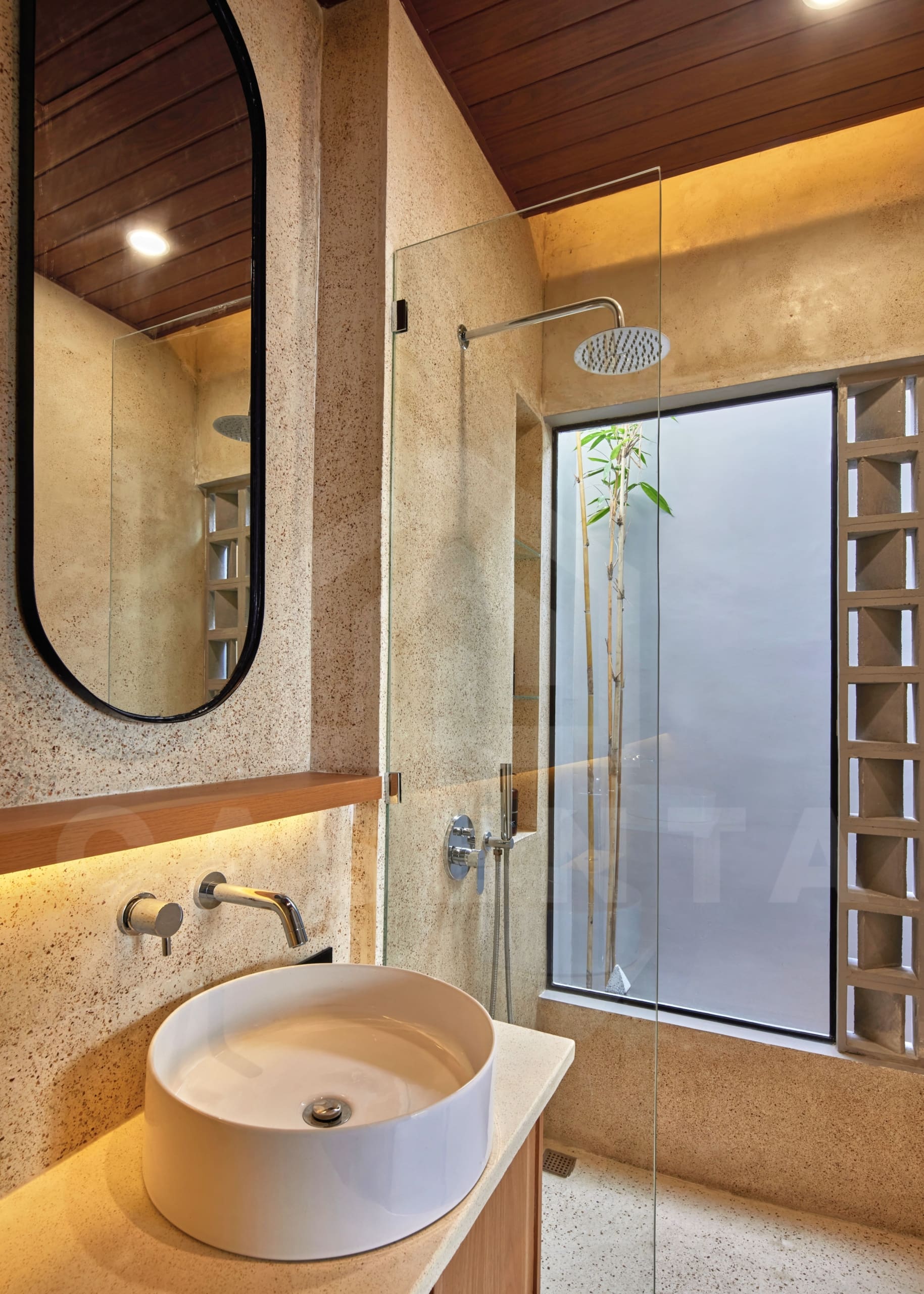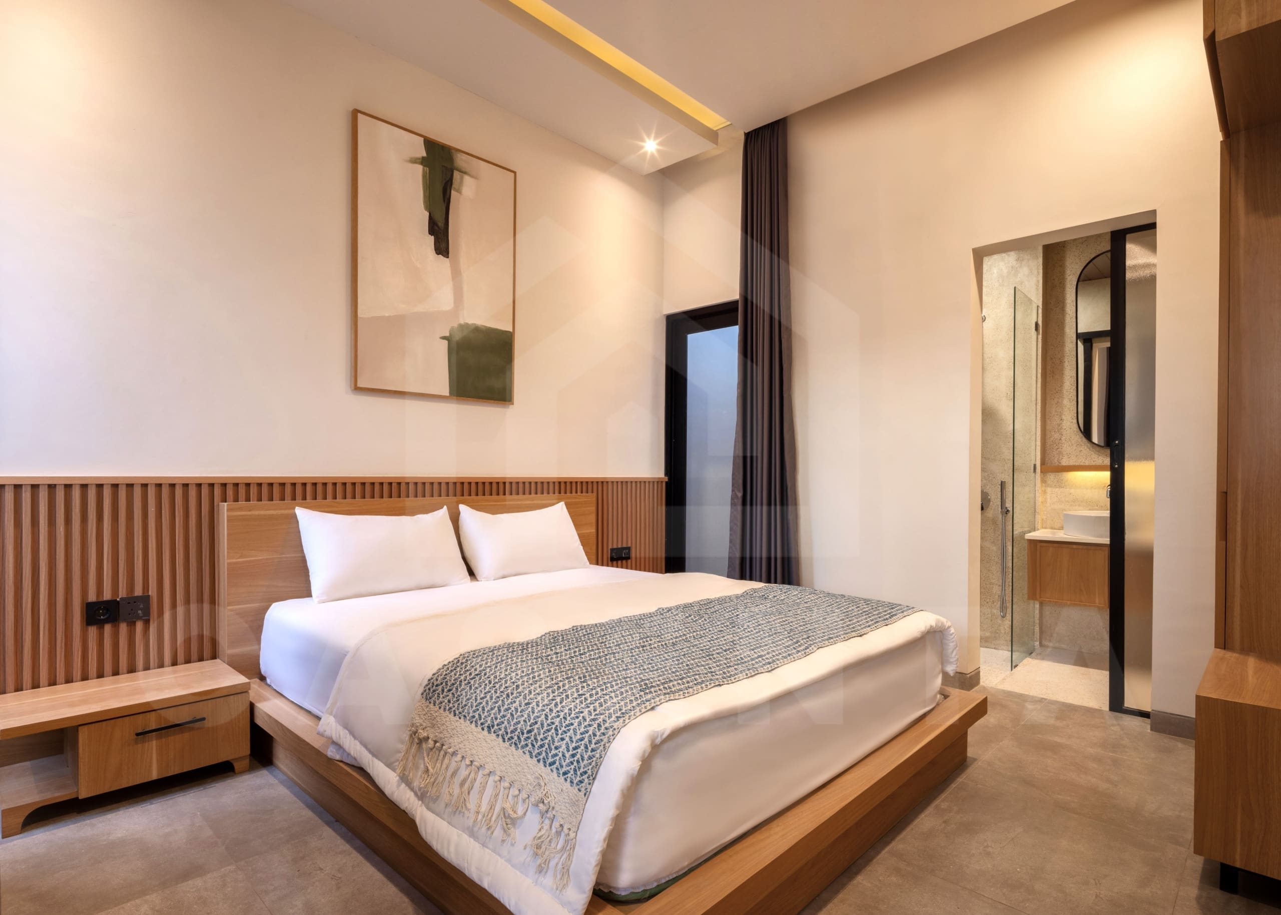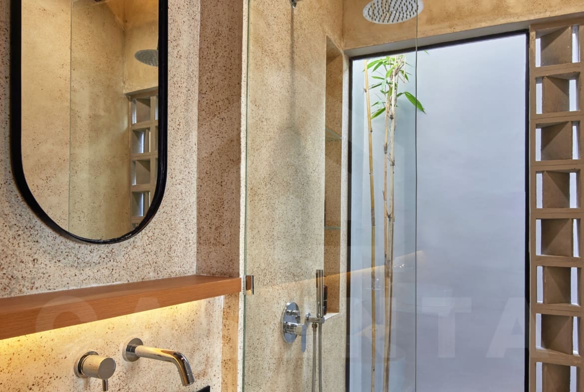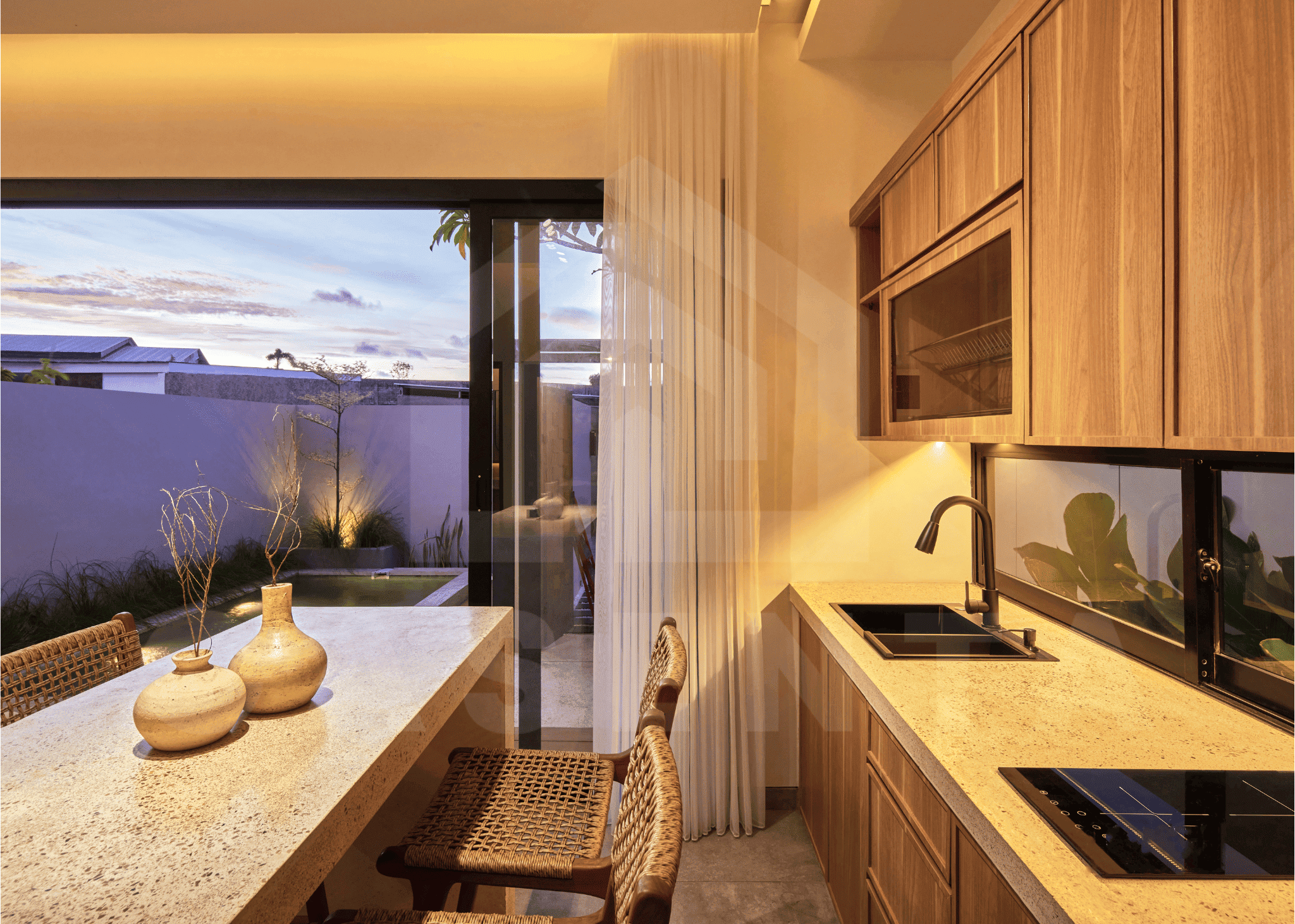 Upon entering the villa, a comforting sight of serene Japanese garden welcomes you. The area is dominated by white marbles and wooden deck with small trees and bushes adding further aesthetics. Traditional Japanese seating and built-in bench are available next to the pool to enjoy relaxing evening by the pool.